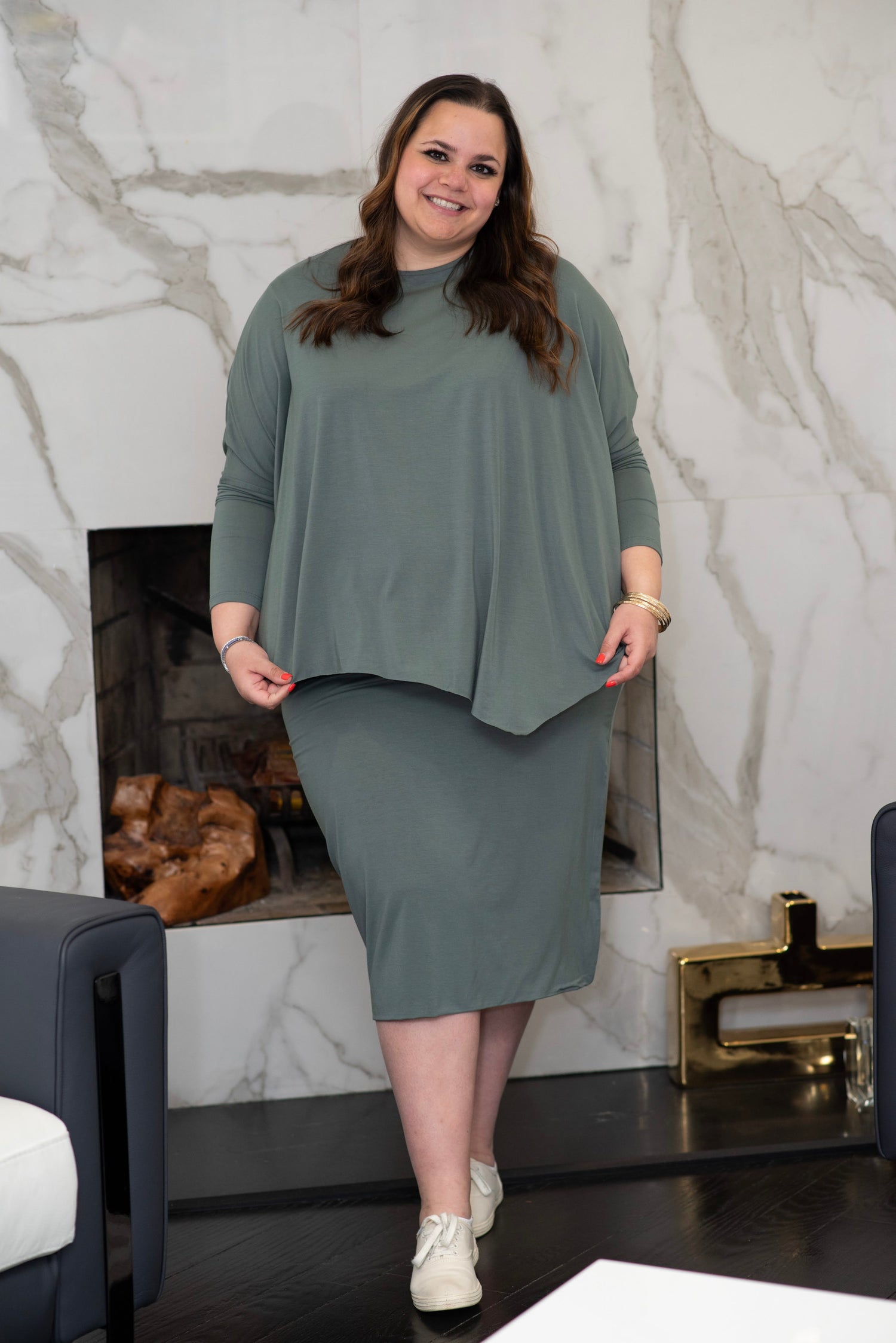 The skirt is meant to be very fitted, and looks great with our oversized tops.