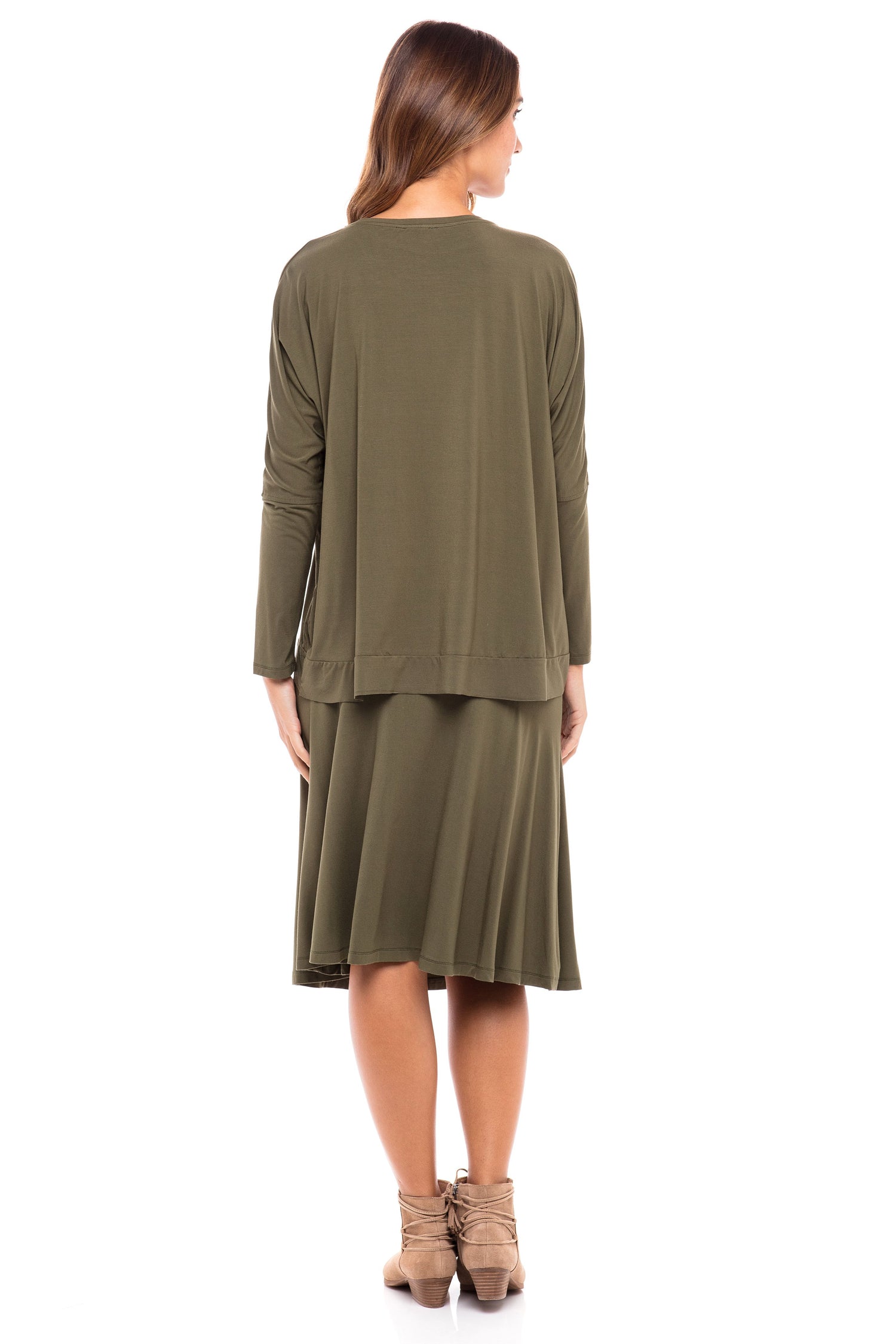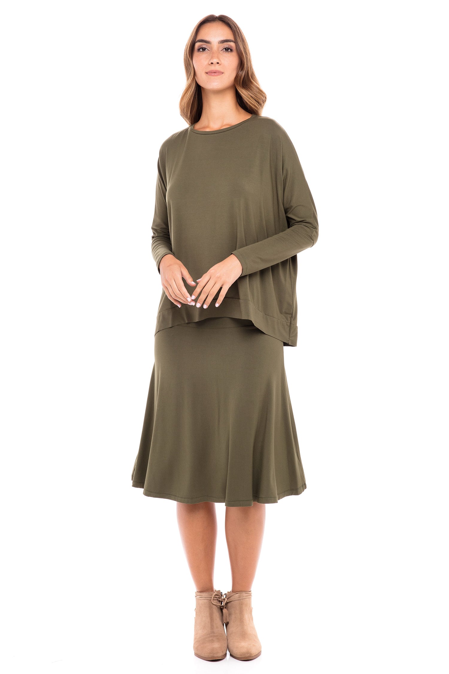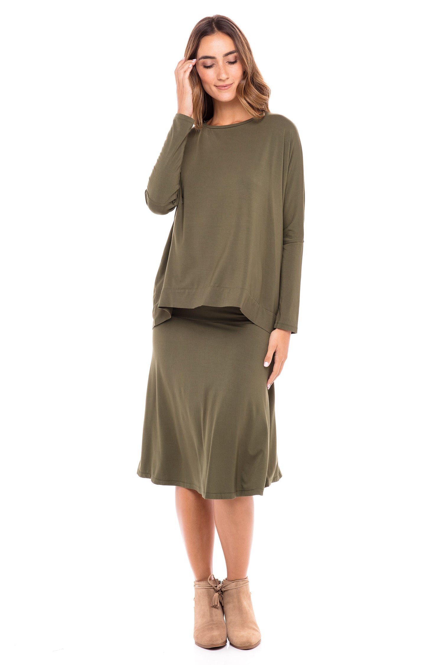 When an amazing style & cut "the skye set" is so popular and our Jersey fabrics that everyone keeps asking for are combined together you get this perfect modal hi-lo Skye top is your new closet staple! Pair with any of the a-line skirts, or wear it with its matching color for a monochrome look! Wear this set with sneakers for a casual look or with some heels to dress this set up!