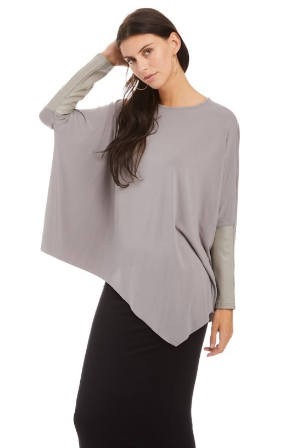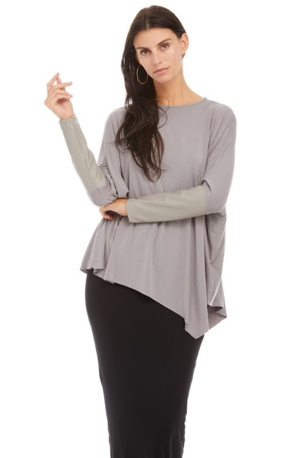 Everyone's favorite asymmetrical jersey top with a TWIST! We brought back the Eden with a leather sleeve that will dress up any outfit you wear. Match it with any of our a-line Skye skirts! This basic over sized top packs it all, comfort and style. Effortless, yet stylish and chic at the same time. Throw it over a skirt, layer it over a fitted dress, belt it, blouse it, knot it, tuck it in... the possibilities are endless!