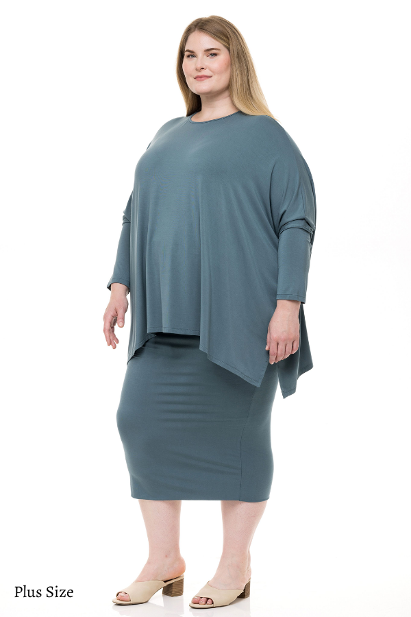 The perfect loose, every day, year round must have basic! With an over sized box fit that EVERYONE will love, just as easy to dress it up as it is to dress it down, so versatile and flattering it doesn't get any better!! How does the Ellie compare to the Eden? The same concept of our favorite fitted sleeve and loose body, but with a symmetrical hi-lo hem, side slits, and longer. Over-sized, size down Can easily be tucked in, belted, the options are endless! Long sleeves Round neck Hi-lo hem Side slits.