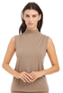 Hacci pronounced “hah-chee” . It means a knit fabric loosely woven together. With its high viscose content, it feels like cashmere but is much more affordable. Turtleneck top with a sleeveless silhouette that's sure to flatter any shape.