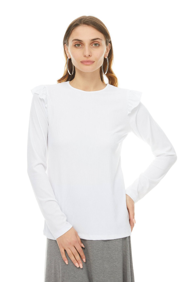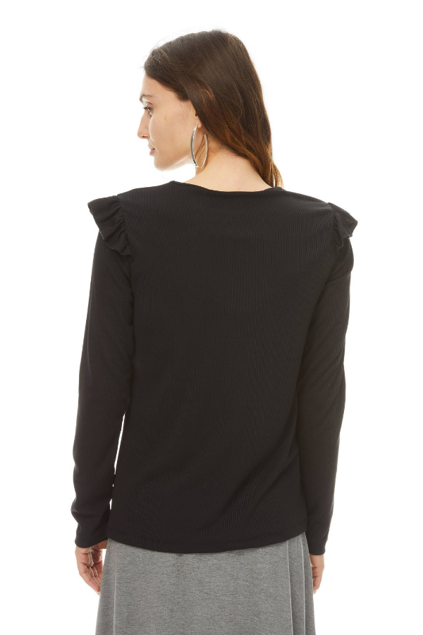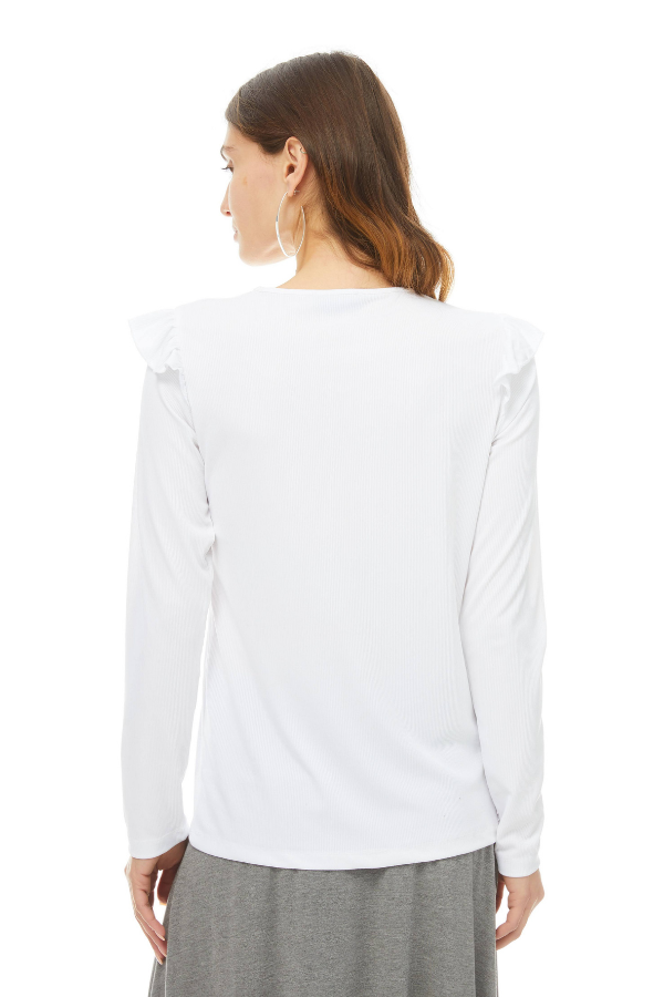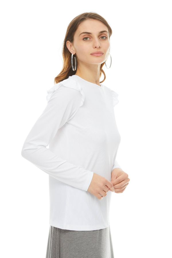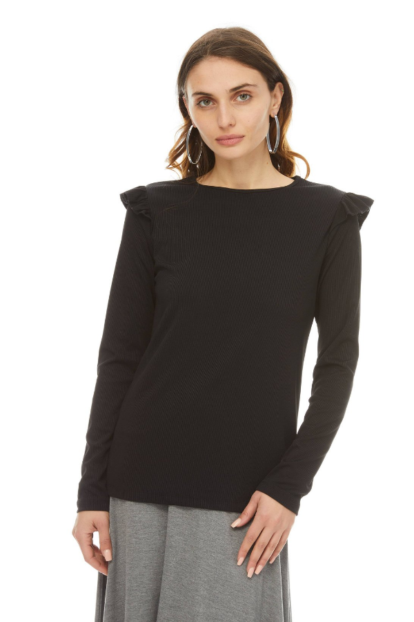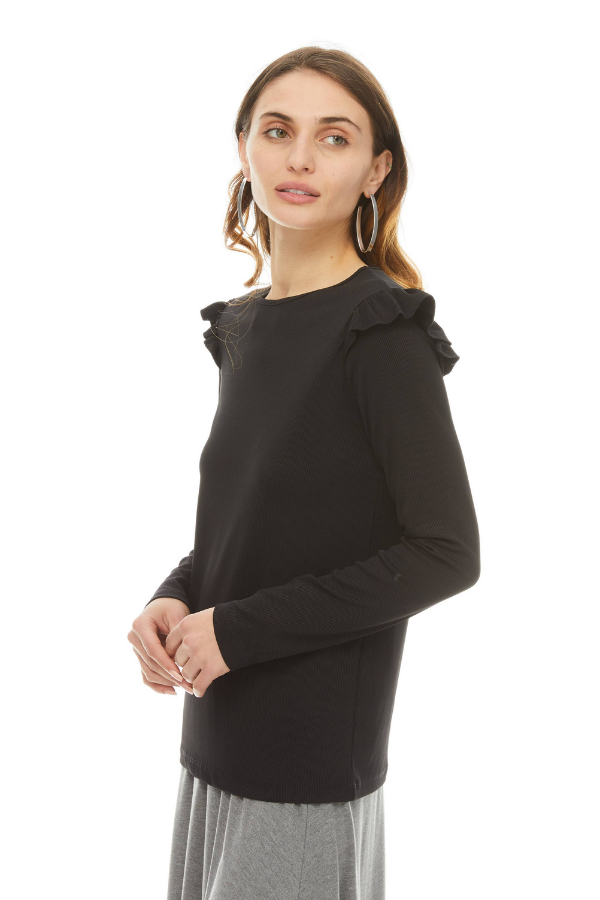 Ruffle shoulders lend a feminine flourish to this fine ribbed top. Crew neck and long sleeves. Can be dresses up or down with our modal Skye skirt.
